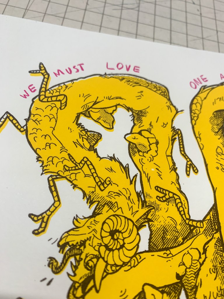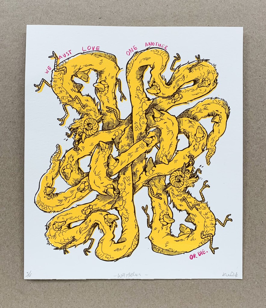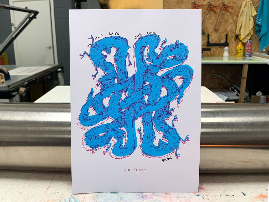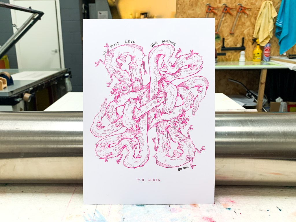 I produced a series of screenprints that combined my favourite poem, September 1st, 1939 by W H Auden and the concept of an Ouroboros, the ancient symbol of a dragon eating its own tail.